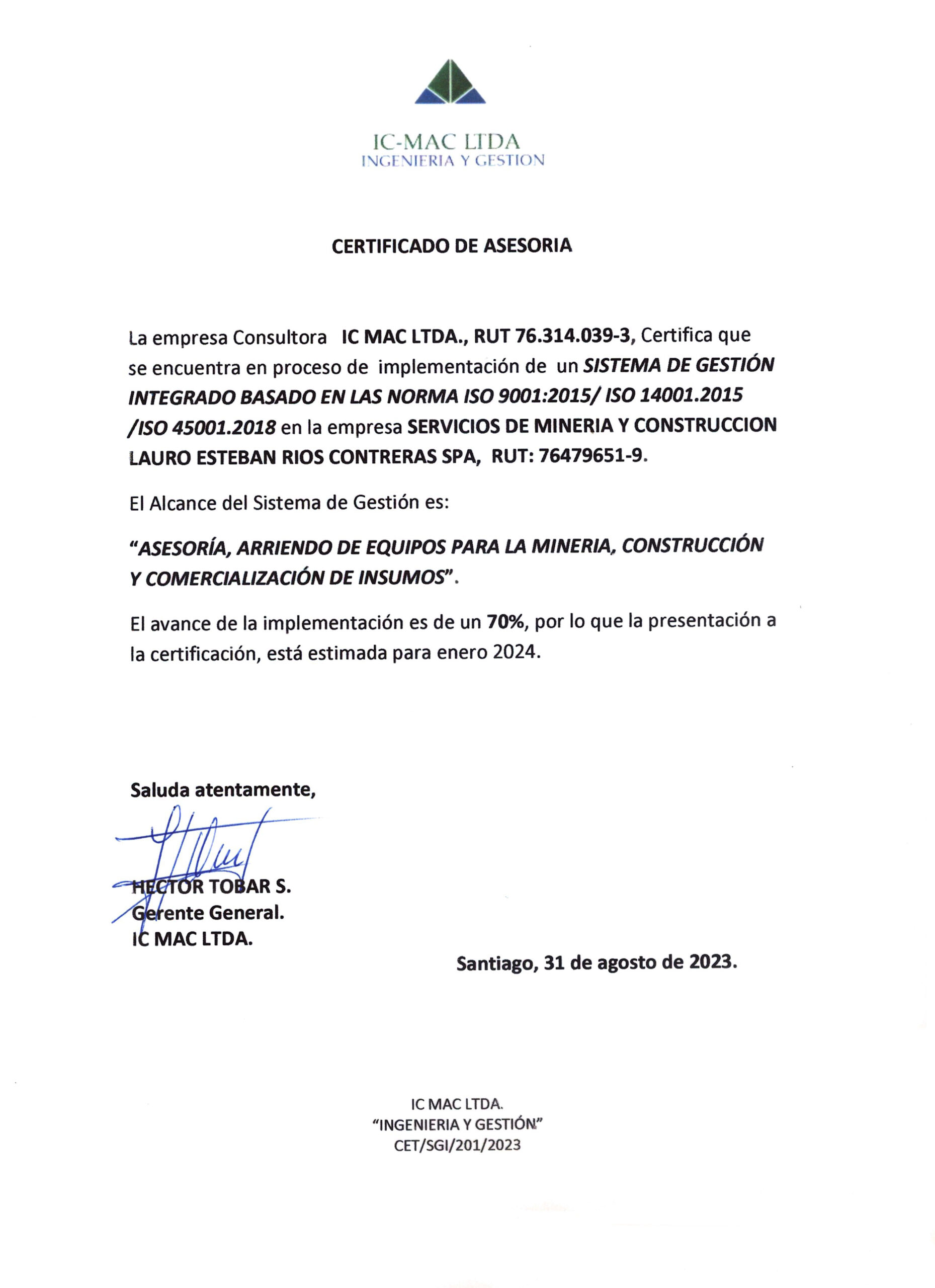 Serminco CERTIFICACIONES Estamos en proceso de implementación para certificación ISO 9001. 2015 / 14001.2015 /45001.2018 Contacto EMAIL contacto@sermincospa.cl CELULAR +56 9 6155 5969 ENVÍANOS UN MENSAJE Nombre Email Mensaje enviar
